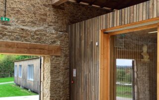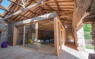 Murs ossature bois, charpente traditionnelle, plancher bois et menuiserie bois pour la rénovation d’une salle de réception :