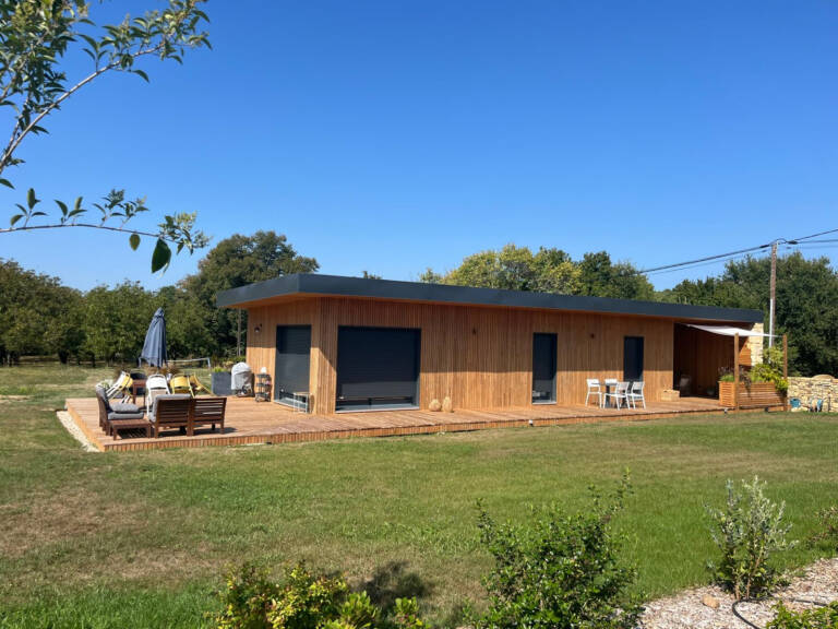 - Un hangar de stockage et abri pour véhicules sur 140m², avec une finition extérieure en enduit sur polystyrène, et une toiture à 3% de pente avec une étanchéité avec membrane sur supports en bacs acier